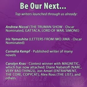 Take your Chance to be the next Academy Award winner discovered by WriteMovies founder Alex Ross. The WriteMovies International Writing Contest for screenwriters, TV Writers, Playwrights, Novelists and Short Story writers. Like 1000’s of other successful writers, you can find out if you have the right project for the studios and if you do, we will go to bat for you! Alex Ross (founder of WriteMovies), has discovered two Academy Award nominees. Will you be the third? Let us show you how to make your script fly. When it does, we will personally submit it to several top agencies, production companies and studios for you. Only 1000 entries will be accepted. Enter early and save! Out of close to three hundred “contest sites”, WriteMovies is one of only a handful that has produced movies from winning projects. THE LIST was written by WriteMovies winner Marcus Folmar and distributed by Warner Bros. Several novels have also been published and plays produced. Production companies, studios and agencies contact us all the time about our winners. The founder of the company discovered Andrew Niccol who wrote & produced THE TRUMAN SHOW (Academy Nominated) as well as Iris Yamashita, Academy Nominated for LETTERS FROM IWO JIMA amongst others. We succeed when you succeed.