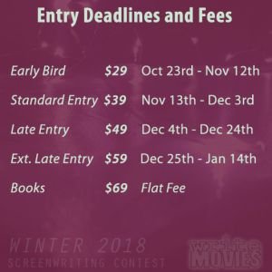 To simply enter the main Contest (PayPal & cards accepted): [nicepaypallite name=”WriteMovies Summer 2017 Competition – Initial Payment Button (may require further payment depending upon submission date)” amount=”29.00″]