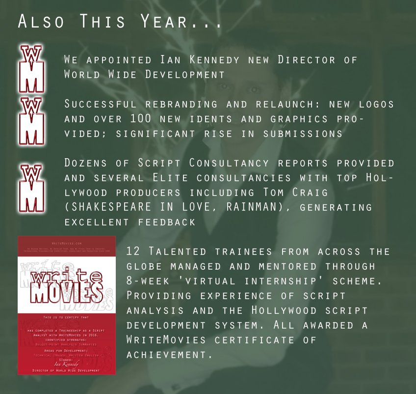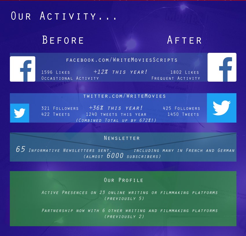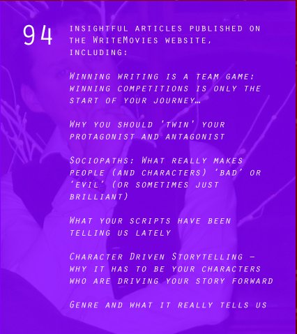 Our Year 2016-17 – our latest top-quality infographic all about what we’ve achieved for you in the past year since our relaunch in early 2016… this is the life of a Screenwriting Company.
